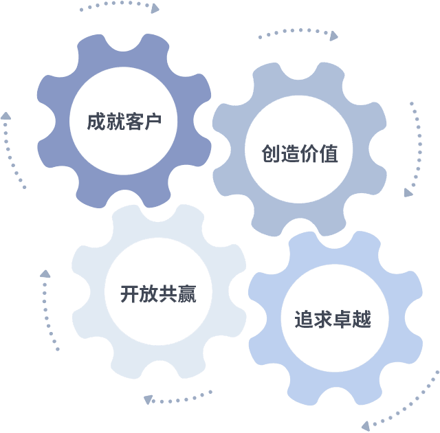 成就客户是一切决策的出发点,,创造价值是衡量所有工作的标准,,,追求卓越是我们做事做人的态度,,,,开放共赢是我们的格局也是最终的结果。。。。价值观的齿轮环环相扣,,,推动着组织里的每个人不断向前。。。